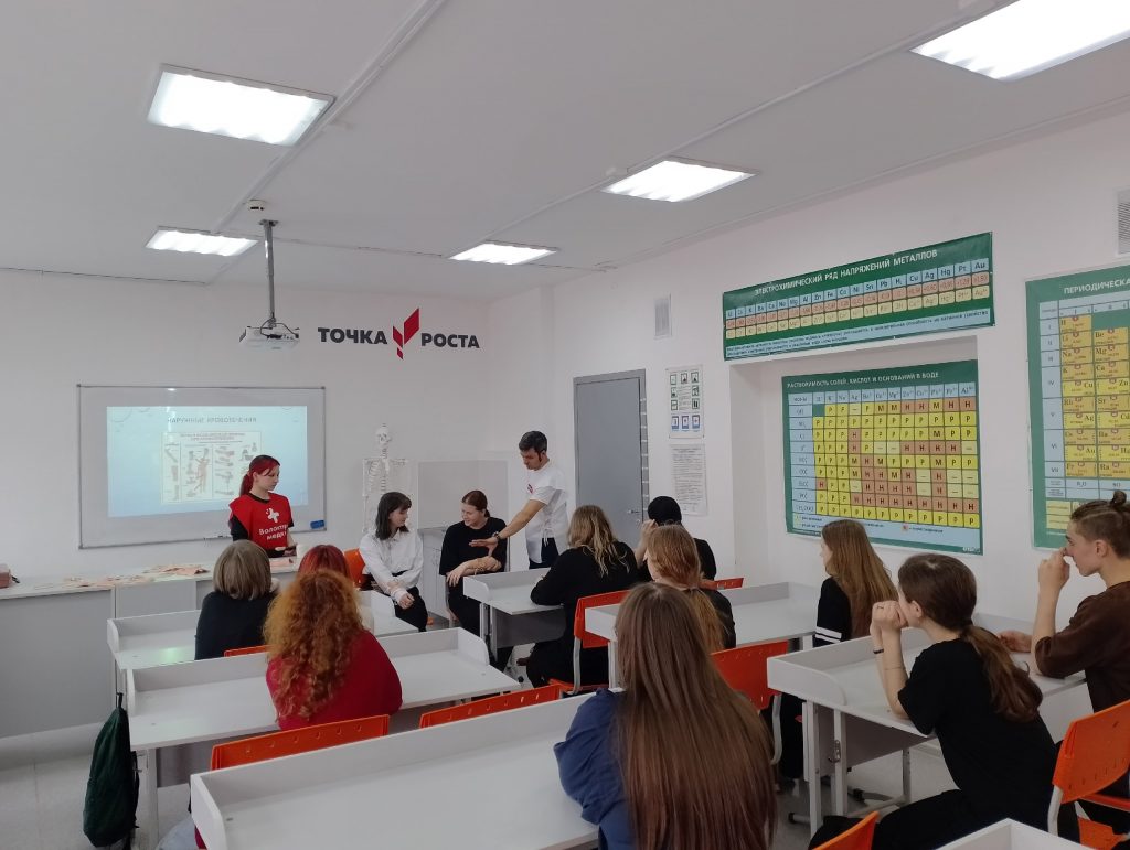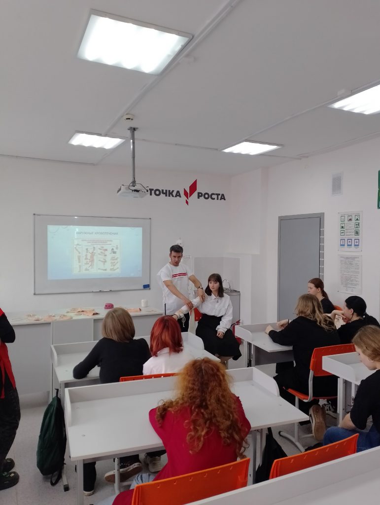 18 апреля в рамках реализации модуля » Химия в белом халате» ДООП » За страницами учебника химии» состоялась 1 встреча в центре образования «Точка роста»с педагогом Красноуфимского филиала ГБПОУ «Свердловский областной медицинский колледж» Стариковым Алексеем Юрьевичем и студенткой 3 курса этого же учреждения, которые рассказали и наглядно показали нам, как оказывать первую помощь при кровотечениях, ожогах, обмороке, отравлении, судорожном припадке.
